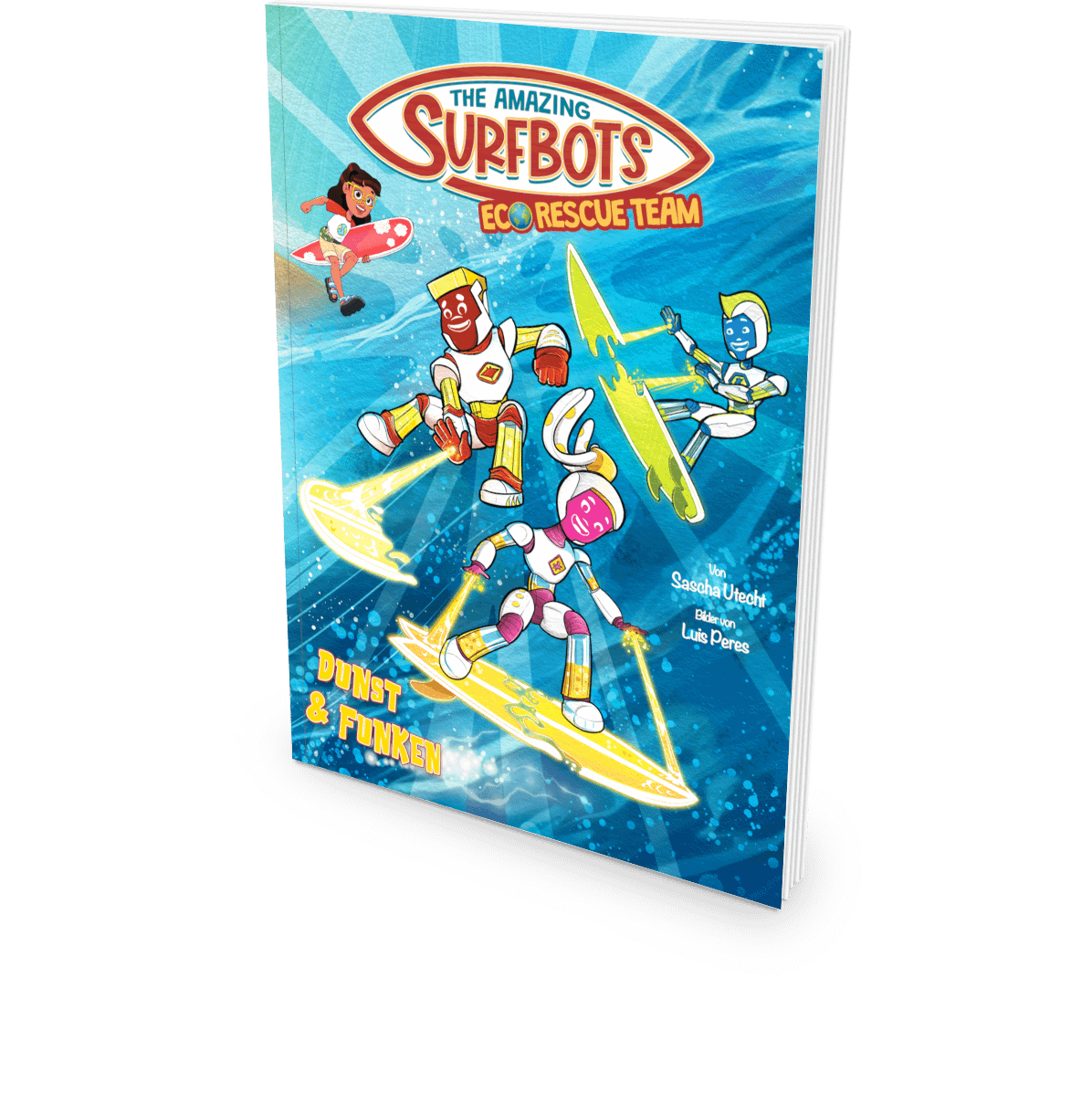 Abenteuer, Spaß und fesselnde Illustrationen mit massig Surfstimmung – Alien-Roboter, die sich in Surfbretter mit Spezialkräften verwandeln, geben alles, um die Meereslebewesen zu retten! Interessante und wichtige Fakten über Plastikverschmutzung und eine Rätselseite machen dieses Buch zu einem tollen Geschenk für die Kinder in Ihrer Familie. Viel Spaß beim Lesen. – Barton Lynch, ehem. Surf-Weltmeister und Dad.